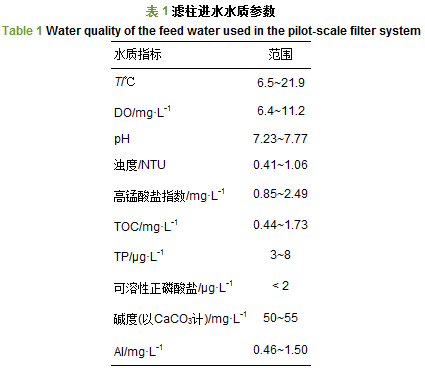 地表水源水經過混凝沉淀處理后, 通過加藥泵向沉后水中投加一定量的氨氮(NH4Cl), 調節進水氨氮濃度, 再由濾柱進行過濾處理.實驗期間, 濾柱進水水質參數如表 1所示.