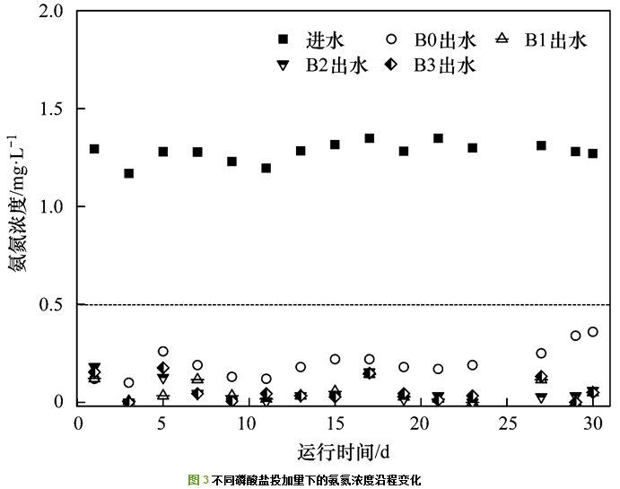 2 結果與討論 2.1 不同磷酸鹽投加量對鐵錳復合氧化膜活性的影響 2.1.1 不同磷酸鹽投加量下的氨氮去除效果