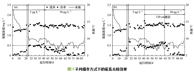 冬季低溫階段, 水溫低于10.5℃時, 活性氧化膜的氨氮去除活性明顯下降, 采取增加磷酸鹽投加量至30 μg·L-1和將濾層厚度從85 cm增至120 cm兩種操作方式以保證系統對氨氮的處理效果, 比較其效果差異, 并考察濾柱的最大氨氮去除能力.