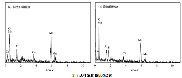 為進一步研究磷酸鹽影響活性氧化膜催化氧化活性的機制, 對未投加與投加磷酸鹽濾柱的濾料進行SEM和EDS表征分析.由圖 8的SEM表征結果可知, 未投加磷酸鹽的濾料表面比較粗糙, 而投加磷酸鹽的濾料表面較為光滑, 其表面形貌的差異很可能是因為磷酸鹽的投加造成的.由圖 9的EDS表征結果顯示, 未投加與投加磷酸鹽的濾料表面元素基本相同, 主要為Mn、O、Al、Ca等.與地下水條件的濾料表面元素對比發現, Al并不是活性氧化膜的原始組成元素, 因此活性氧化膜應用于地表水處理后其催化氧化活性有所下降很有可能是Al在濾料表面積累導致的.未投加與投加磷酸鹽條件下的活性氧化膜表面Al原子百分比分別為8.70%和7.18%, 且濾料表面未檢測到P元素的存在, 推測可能是磷酸鹽與濾料表面的Al結合成其它形態, 使其易于從濾料表面脫落, 從而削弱了Al對活性氧化膜的影響.