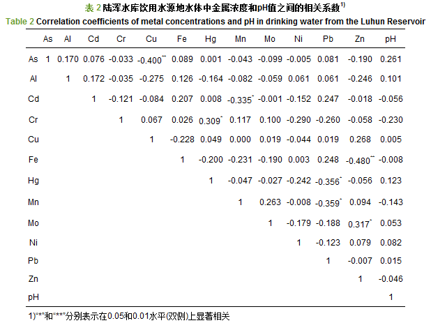 采用Spearman相關(guān)系數(shù)分析陸渾水庫飲用水源地水體中金屬濃度和pH值的相關(guān)關(guān)系, 結(jié)果如表 2所示.從中可知, 在0.05水平上, Cr與Hg之間、Mo與Zn之間呈顯著正相關(guān), 平均相關(guān)系數(shù)分別為0.309、0.317, 說明這幾種元素之間的地球化學(xué)性質(zhì)相近, 且具有一定的同源性.在0.01水平上, As與Cu之間、Fe與Zn之間呈顯著負(fù)相關(guān), 在0.05水平上, Cd與Mn之間、Hg與Pb之間、Mn與Pb之間呈顯著負(fù)相關(guān), Al和Ni與其他金屬元素之間無顯著性相關(guān)關(guān)系, 說明其來源不同.此外, 水庫水體中金屬元素與水體pH值之間無顯著性相關(guān)關(guān)系, 說明pH不是影響水庫水體中金屬濃度分布的主要影響因子.