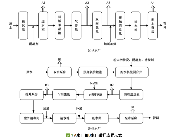 選取天津市某自來水廠A水廠和B水廠為研究對象, A、B水廠采用相同水源(以引江水為主, 灤河水為備用水源). A、B水廠供水能力分別50萬m3·d-1和30萬m3·d-1, 均采集原水、濾前水、濾后水和水廠出水, 各水廠的工藝單元流程及采樣點見圖 1.每次連續放水10 min后用水樣采集器采集水樣5 L, 采集完成后用棕色瓶迅速運回實驗室, 4℃避光保存, 24 h內進行抗生素的檢測分析(每份樣品均設置兩個平行樣品, 以平均值作為該樣品的分析結果), 總共隨機采樣12次.