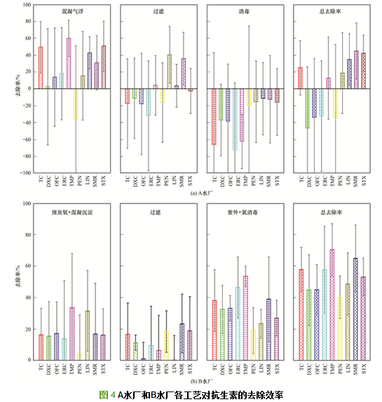式中, ηj, i:j工藝對抗生素i的去除率; cj, i:j工藝中抗生素i的濃度, ng·L-1; cj+1, i:j工藝后續工藝中抗生素i的濃度, ng·L-1; η總, i:水廠各工藝對抗生素i的總去除率; c原水, i:原水中抗生素i的濃度, ng·L-1; c出水, i:出水中抗生素i的濃度, ng·L-1.