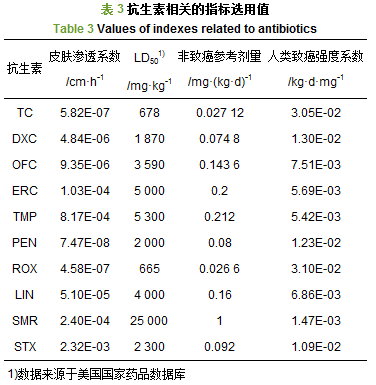 式中, LD50(median lethal dose):動物半數致死量(數據來源于美國國家藥品數據庫), mg·kg-1; 4×10-5為經驗轉化系數, d-1.