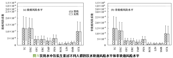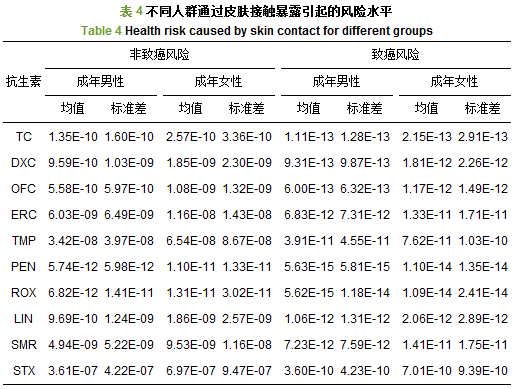 圖 5為通過飲水途徑暴露引起的致癌和非致癌風險水平, 其中四環素、強力霉素和磺胺甲唑所引起的致癌風險水平最高, 處于10-7數量級, 與警戒值(虛橫線)僅相差一個數量級, 其余抗生素的致癌風險均處于10-8數量級.各抗生素通過皮膚接觸途徑的風險水平見表 4, 其中磺胺甲唑通過皮膚接觸途徑所引起的風險水平最高.健康風險評價結果表明, 飲用水中多種抗生素引起的致癌風險和非致癌風險均屬可接受風險.飲水途徑所致風險遠高于皮膚接觸, 其中通過飲水途徑造成的風險為成年男性高于成年女性, 皮膚接觸途徑則呈相反規律.如表 4所示, 抗生素經皮膚接觸導致的非致癌風險從10-12~10-7數量級不等, 致癌風險處于10-13~10-10的數量級, 均低于警戒值, 屬于可接受風險.對飲用水中10種抗生素的總致癌風險和非致癌風險進行模擬計算得到不同人群總致癌風險值(男性5.64×10-7, 女性5.45×10-7)和總非致癌風險(男性5.78×10-4, 女性5.59×10-4)都處于可接受風險水平.