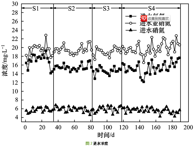 S1階段為厭氧氨氧化工藝啟動階段, 基質(zhì)為A/O除磷和亞硝化工藝處理后的生活污水. S2~S4階段為SAD工藝運行階段, S2、S3和S4階段分別投加10、20、30 mg·L-1有機物.