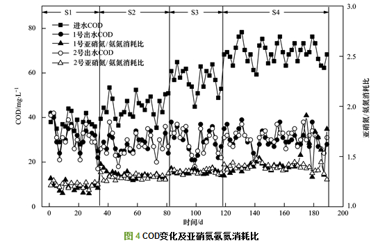 S3階段1號反應器亞硝氮氨氮消耗比上升至1.34, 特征比上升至21.92. 2號反應器亞硝氮氨氮消耗比為1.35, 平均特征比為25.51.亞硝氮氨氮消耗比及特征比的升高, 表明硝化細菌作用進一步得到提高.反應器保持著高效厭氧氨氧化活性的同時, 提高了反硝化菌的活性.根據(jù)厭氧氨氧化方程式計算[5], 厭氧氨氧化途徑的氮損約為90%, 反硝化氮損約占10%.