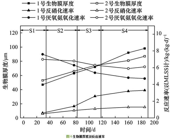 在反應器運行過程中, 生物膜厚度不斷增加. 1號反應器生物膜厚度增長較快, 污泥厭氧氨氧化速率下降明顯, 反硝化速率顯著升高, 生物膜厚度的增長主要來源于反硝化菌的大量繁殖. 2號反應器生物膜厚度增長較慢, 厭氧氨氧化反應速率和反硝化速率變化幅度較小, 表明適量投加丙酸鈉不會導致反硝化菌大量增殖, 2號反應器總氮去除率的提高主要來自厭氧氨氧化菌等微生物的異養(yǎng)代謝.