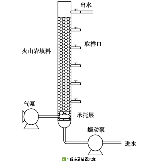 試驗采用2個完全相同的上向流生物濾柱(圖 1), 編號為1號和2號.反應器由有機玻璃制成, 內(nèi)徑20 cm, 承托層高5 cm, 濾料高50 cm, 有效體積15 L.濾柱每隔10 cm設置取樣口, 承托層采用粒徑為4~8 mm的礫石, 內(nèi)部裝填直徑5~10 mm的火山巖填料, 為了避免生物膜過量增殖導致濾柱堵塞的問題, 在底部設曝氣裝置以進行氣水反沖洗.整個反應器外部用黑色保溫棉纏繞以避光和保溫.