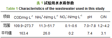 試驗裝置主要包括序批式SBR反應器(內、外徑分別為14 cm和15 cm, 有效容積為5 L)和自動控制系統(水溫自動控制系統和過程控制系統)兩部分組成.通過水溫自動控制系統以維持SBR反應器的運行溫度.借助于過程控制系統[以溶解氧(DO)、pH和氧化還原電位(ORP)為控制參數]準確指示生化反應的進程.本試驗用水取自蘭州交通大學家屬區生活污水, 主要水質參數見表 1.
