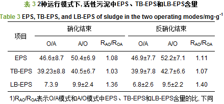 RA/O系統中的EPS、LB-EPS和TB-EPS含量均略高于RO/A系統產生的量, 也就是說, 缺氧/好氧運行模式更有利于活性污泥產生EPS.從表 3還可以清楚看出, 對于硝化結束和反硝化結束時, LB-EPS在RO/A和RA/O系統中的比值分別為1.36和1.4, 因此相對于EPS和TB-EPS, 運行模式對LB-EPS含量變化影響較大.關于運行模式對EPS和TB-EPS產量的影響, 研究者獲得的結論也不盡相同, 有研究認為雖然運行模式對EPS和TB-EPS產量影響不顯著, 但對TB-EPS中的PN和PS產量有顯著影響, 同時有研究者認為運行模式對EPS產量有顯著影響.本研究中運行模式對EPS和TB-EPS有一定影響, 但并不顯著, 而對于LB-EPS影響較為顯著.