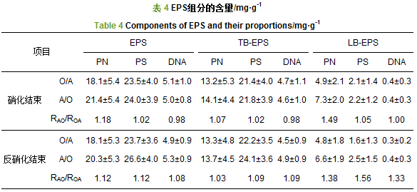 此外, 對比2個系統硝化結束和反硝化結束時EPS含量可以發現, RO/A系統硝化結束和反硝化結束時, EPS、LB-EPS和TB-EPS含量幾乎相同.而對于RA/O系統, 硝化結束時EPS和TB-EPS含量略低于反硝化結束時, LB-EPS含量卻高于反硝化結束時.