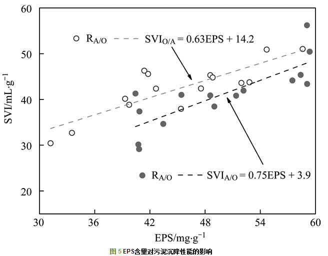 此外, 通過對RO/A和RA/O系統中SVI和EPS的數據進行擬合, 可得回歸方程分別為SVIO/A=0.63EPS+14.2和SVIA/O=0.75EPS+3.9, 表明兩者均呈現線性正相關, 國內有學者得到的回歸方程為SVI=4.12EPS+21.66.通過對比回歸方程的斜率還可以看出, 相對于RO/A系統回歸方程的斜率(為0.63), RA/O系統回歸方程的斜率較大(為0.75), 說明在RA/O系統中EPS對污泥的沉降性能影響更為顯著.