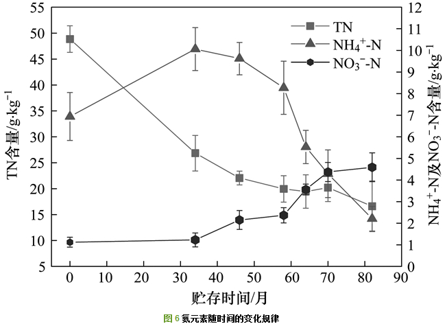 從圖 6可以發現NH4+-N含量先逐漸上升, 后持續減少, 最初為(6.94±1.11) g·kg-1, 在第34個月達到最大值(10.06±0.99) g·kg-1, 最后降至(2.21±0.57) g·kg-1. NO3--N含量在此過程中表現出與NH4+-N相反的趨勢, 含量呈現輕微的上升趨勢, 增加幅度有限.這主要是由于在初期, 有機氮不斷被微生物分解為銨態氮, 因此銨態氮含量出現短暫上升.之后銨態氮轉化為氨氣揮發, 以及硝化細菌的硝化作用, 使得銨態氮含量下降, 硝態氮含量呈現上升.同時在貯存初期較低的C/N比, 意味著氮素過量, 使得氮素很容易轉化為氨氣揮發而導致氮素損失.同時隨著貯存時間延長局部缺氧會導致硝態氮的反硝化作用加強, 進一步導致氮素損失.
