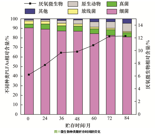 貯存污泥成分復雜, 含有大量的微生物, 細菌、真菌、放線菌以原生動物等均可出現在污泥中, 圖 8呈現了污泥中不同微生物種類的變化趨勢以及厭氧微生物的變化趨勢.