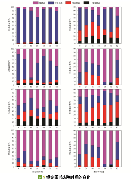 可以發現各種形態之間的轉化并不明顯, 且大部分的重金屬始終以比較穩定的可氧化態和殘渣態形態存在, 并未發現可交換態等不穩定態向較穩定的可氧化態及殘渣態大幅度轉變, 說明貯存時間對重金屬形態變化影響并不顯著.