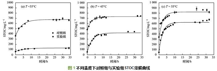 式中, ct為t時刻溶解性TOC(STOC)濃度, mg·L-1; ce為反應達到平衡時STOC濃度, mg·L-1; c0為初始STOC濃度; k為溶解速率常數, h-1; t為反應時間, h.