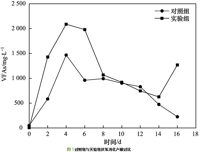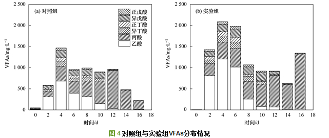 圖 3為對照組與實驗組厭氧消化16 d的VFAs變化.實驗組污泥的厭氧消化VFAs產量顯著高于對照組.實驗組和對照組在第4 d時達到最高值, 分別為2 088 mg·L-1和1 467 mg·L-1, 提升42%.在第6 d時, 對照組VFAs已大幅下降, 而實驗組依然保持較高的濃度, 直到第8 d大幅下降, 暗示實驗組可能出現酸抑制現象.對照組VFAs自第4 d后開始持續下降, 直到第16 d降至最低, 而實驗組在第14 d后上升, 第16 d小幅回升, 暗示在相同接種比的條件下, 實驗組對VFA的利用速率要低于對照組.綜合實驗結果可知, EDTA預處理能增加厭氧產酸階段VFAs的產生.這是由于經EDTA預處理后, 污泥有機質溶出表觀活化能降低, 有機質大量溶出, 有利于VFAs的形成.