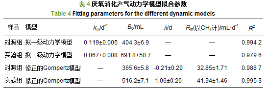 Bolado-Rodríguez等[35]的研究認為, 擬一級動力學模型主要應用于描繪和說明水解階段是厭氧消化過程限速步驟, 而修正的Gompertz模型則假設產甲烷過程是特定功能菌的生長過程, 由于消化過程中存在某種抑制因素, 因而限制了整個消化過程, 通常應用于產甲烷階段限速的厭氧消化過程.