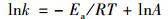 大量研究發現水解階段是污泥厭氧消化的限速步驟, 污泥厭氧消化的水解階段主要包括污泥有機質從固態的溶出和水溶性大分子有機物水解為微生物可直接利用的小分子有機物, 而前者通常被認為是關鍵步驟[4].因此, 提高污泥有機質溶出能力能有效加快水解速度, 提高后續厭氧消化產甲烷水平.污泥有機質溶出的表觀活化能(apparent activation energy, AAE)可用來表征污泥有機質溶出所需能量[18, 27], 說明污泥有機物溶出的難易程度, 為考察對照組和實驗組污泥的有機物溶解能力, 本文測定并計算了污泥樣品的AAE. AAE可以由Arrhenius公式[式(1)]計算而得, 式(1)可以變換為式(2)的形式便于計算: