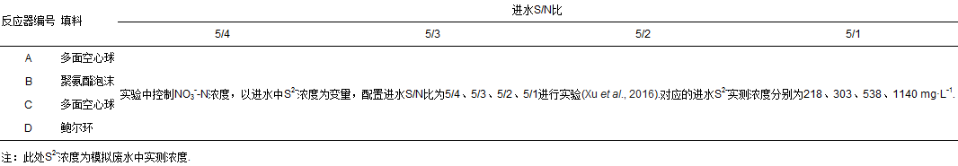 實現SDD關鍵性因素包括溫度、pH值、填料、S/N比等.通過反應方程式(1)、(2)可知,當NO3-含量被限制時,S2-僅僅被氧化成S0.而當NO3-含量充足時,S2-完全被氧化成SO42-.這意味著S/N摩爾比是控制副產物種類的關鍵性因素.填料作為微生物生存的載體,它能提高微生物與廢水有效接觸面,對SDD過程起著很重要的影響.而且,填料的經濟性對控制工程成本也至關重要.因此,本文的研究重點主要是構建SDD反應器,并研究填料、進水S/N摩爾比對SDD過程的影響.借助SEM掃描電鏡和16S rRNA高通量測序技術研究構建的反應器中微生物群落結構特征.