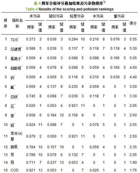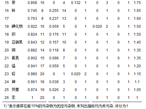 依據(jù)統(tǒng)計學(xué)原理, 用各個指標(biāo)污染程度頻率分布來表征該指標(biāo)的污染程度大小, 且能最大限度地利用所有水樣測試數(shù)據(jù).由于同一指標(biāo)在不同采樣點的污染級別不盡相同, 因此在污染評價結(jié)果的基礎(chǔ)上, 統(tǒng)計每項指標(biāo)在各個污染級別的采樣點數(shù)目, 并計算其相應(yīng)頻率.將所有指標(biāo)在相同污染級別的頻率由小到大排序并從1~n賦值, 并運(yùn)用層次分析法計算得到污染級別在未污染、疑似污染、輕度污染、中污染、重污染權(quán)重依次為0、0.05、0.15、0.3、0.5.根據(jù)式(1)按照分級評分法疊加得到各個指標(biāo)的綜合污染指數(shù)Pi, 按照各個指標(biāo)的綜合污染指數(shù)大小排序, 從而實現(xiàn)優(yōu)控污染物的篩選, 結(jié)果如表 4所示.