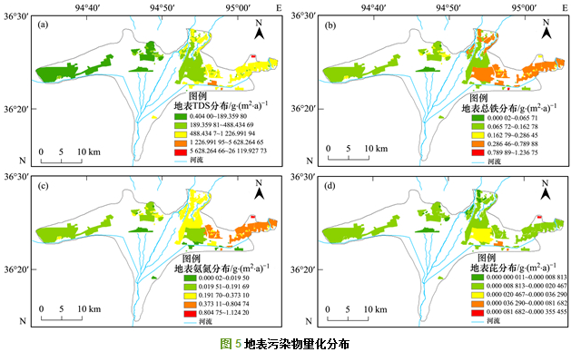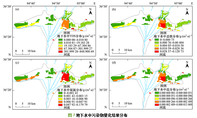 研究區(qū)主要污染源有生活污染源、工業(yè)污染源、農(nóng)業(yè)污染源3類, 進(jìn)入地下水中的每一種污染物是這3類污染源共同作用的結(jié)果.利用17組污染源水樣測試結(jié)果, 根據(jù)各類污染源中的每一種污染物實測濃度, 結(jié)合各類污染源的調(diào)查資料進(jìn)行污染物量化計算, 利用ArcGIS 9.3軟件分別對每一種污染物在3類污染源中的排放量進(jìn)行矢量圖繪制, 并利用軟件中的柵格疊加功能將該種污染物在每一類型污染源中的排放量進(jìn)行疊加, 最終得到研究區(qū)每種污染物排放量的地表分布, 結(jié)果如圖 5所示.