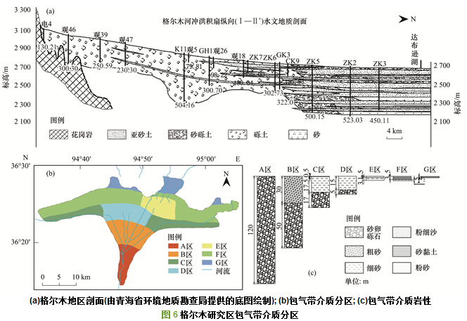 根據(jù)格爾木研究區(qū)剖面及地下水位埋深, 結(jié)合實地踏勘資料, 對研究區(qū)包氣帶介質(zhì)進(jìn)行分區(qū)概化, 共概化為7個不同類型包氣帶介質(zhì)分區(qū)[圖 6(b)], 對于包氣帶每個分區(qū)巖性剖面參考相應(yīng)區(qū)域整體包氣帶屬性來代替整個水文地質(zhì)區(qū)的巖性.巖性剖面用典型的鉆孔巖性來代替整個水文地質(zhì)區(qū)的巖性, 各個包氣帶分區(qū)巖性概括如圖 6(c)所示.