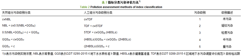 對于天然組分, 直接運(yùn)用已有的天然組分污染級別分類評價方法進(jìn)行污染評價.而對于人工組分, 一類是對于給出水質(zhì)標(biāo)準(zhǔn)的指標(biāo), 直接運(yùn)用已有的人工組分污染級別分類評價方法進(jìn)行評價; 另一類是對于沒有給出水質(zhì)標(biāo)準(zhǔn)的指標(biāo), 在以往的人工組分污染級別分類方法的基礎(chǔ)上引入健康基準(zhǔn)值(HBSLs), 并對該方法進(jìn)行修正. HBSLs是美國地質(zhì)調(diào)查局(USGS)1991年對無強(qiáng)制執(zhí)行標(biāo)準(zhǔn)值的污染物制定的基于健康的評價基準(zhǔn)值, 作為水質(zhì)標(biāo)準(zhǔn)的補(bǔ)充.它是針對水中污染物估算的基準(zhǔn)濃度值, 衡量污染物通過飲水途徑進(jìn)入人體引起的潛在健康問題.因此用USGS給出的HBSLs代替原方法中的GQSⅢ, 再按照將HBSLs放大兩倍原則代替原方法中的GQSⅣ, 指標(biāo)分類污染評價方法見表 2.