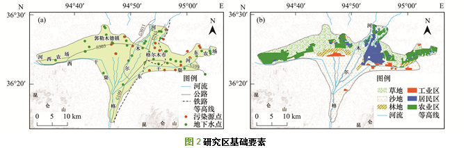 格爾木市依托鹽化、石化為支柱產(chǎn)業(yè), 以河?xùn)|農(nóng)場、河西農(nóng)場為代表的農(nóng)牧業(yè)為該區(qū)的重要產(chǎn)業(yè).區(qū)內(nèi)的居民生活、牲畜、服務(wù)業(yè)、少部分林草地及大部分工業(yè)用水主要使用地下水, 農(nóng)業(yè)灌溉用水主要引自格爾木河.該區(qū)土地開發(fā)利用程度較低, 以農(nóng)業(yè)用地和建設(shè)用地為主, 未利用的沙地、草地較多[圖 2(b)].