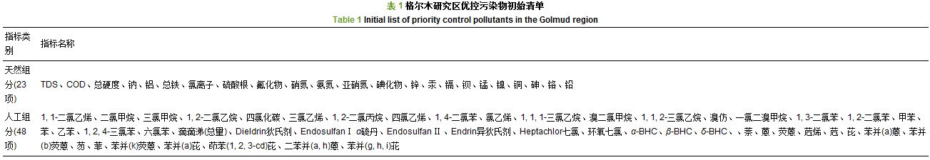 根據(jù)地下水樣測試結(jié)果, 結(jié)合研究區(qū)地下水污染調(diào)查成果及地下水測試結(jié)果, 綜合國內(nèi)外優(yōu)控污染物初始清單的確定原則[9], 對于格爾木研究區(qū)優(yōu)控污染物初始清單的確定應(yīng)遵循以下3點原則:①優(yōu)先篩選檢出量大的污染物; ②優(yōu)先選擇規(guī)范中要求研究區(qū)水樣必測的污染物; ③優(yōu)先選擇國內(nèi)外優(yōu)控污染物名單中包含的污染物.