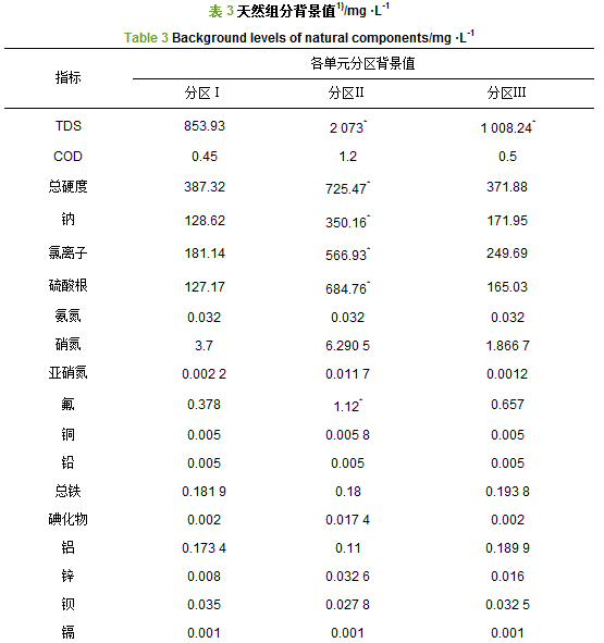 根據(jù)地下水測試結(jié)果, 運(yùn)用1.3節(jié)的方法分別對51組地下水樣的71項指標(biāo)進(jìn)行污染評價.對于天然組分的污染評價, 需要計算天然組分的背景值, 地下水環(huán)境單元的劃分是背景值計算的基礎(chǔ), 它是指一定時間、一定范圍內(nèi)水環(huán)境要素和元素一致的水域地區(qū), 具有時間和區(qū)域變異性.綜合考慮研究區(qū)水文地質(zhì)條件、水化學(xué)特征、地形地貌等因素進(jìn)行地下水環(huán)境單元劃分(圖 3), 在數(shù)據(jù)特征分析及異常識別的基礎(chǔ)上運(yùn)用“平均值加減兩倍標(biāo)準(zhǔn)差”方法計算天然組分的背景值(表 3), 再結(jié)合水質(zhì)標(biāo)準(zhǔn)限值運(yùn)用天然組分污染分級方法進(jìn)行評價, 指標(biāo)分類污染評價統(tǒng)計結(jié)果如圖 4所示.