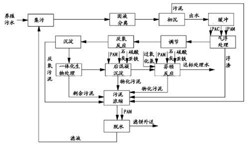 傳統養殖污水處理工藝流程:廢水→粗格柵→初沉池→調節池→UASB反應器→接觸氧化池→混凝沉淀池→排放。