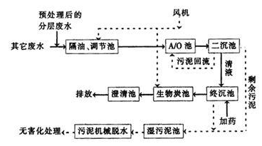 由于洗鍋廢水和裂解真空泵廢水中含有大量石油類污染物,需要增設隔油池,進行預處理。之后進入調節池中,和帶水劑回收分層廢水進行混合,然后再做深度處理。深度處理采用成熟可靠的A/O+物化工藝。