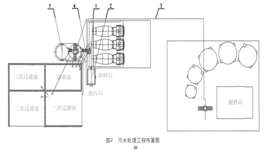 如圖2污水處理工程布置圖所示,污水處理系統(tǒng)由清洗接料槽、混凝土清洗回收設(shè)備、l~3級沉淀過濾池、漿水池、l~3號污水?dāng)嚢杵鳌⑽鬯斔凸苈罚斔蛙嚽逑垂苈泛碗姎饪刂葡到y(tǒng)等部分組成。