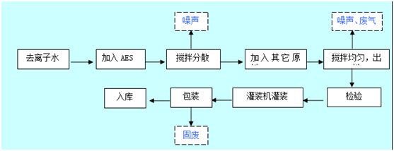 由于洗衣液和洗手液的生產工藝流程及產污環節相似,僅是原輔料投入比有差異,故兩種產品的工藝流程及產污環節可用同一流程圖來表示
