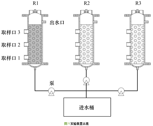 本實驗采用3個內徑均為10 cm、高度為40 cm的升流式固定床反應器.實驗裝置如圖 1所示. 3個反應器均填有2.5 L的硫和石英砂的混合填料, 填充高度均為32 cm, 硫、石英砂的粒徑均為2~3 mm.硫和石英砂體積比分別為2 :1(R1)、1 :1(R2)、1 :2(R3), 孔隙率為(40±1.5)%.根據計量方程式(1)進行物料衡算(HRT為3.2 h, 進水ClO4-為250 mg ·L-1), R1、R2、R3的硫顆粒填料可分別使用3.5、5.2、7.0 a, 可根據運行時間適量補充.
