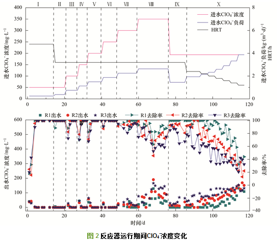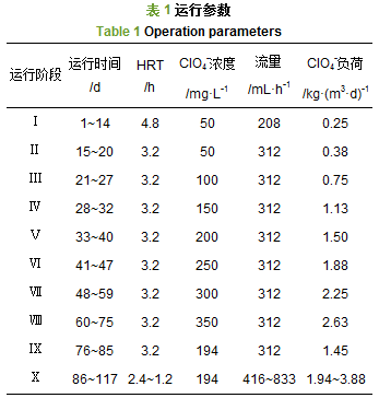 反應器的運行參數如表 1所示, 共分為10個運行階段, 共運行117 d.第Ⅰ階段為啟動期, 采用間歇式進水(進水12 h, 然后停止進水12 h, 依次重復)的方式培養生物膜7 d, 而后變成連續進水運行至反應器啟動成功; 第Ⅱ~Ⅷ階段為濃度提升階段, 考察反應器所能去除的最大ClO4-濃度及不同濃度下的去除效果, HRT為3.2 h, ClO4-濃度由50 mg ·L-1提升至350 mg ·L-1, 每個階段提升50 mg ·L-1, 待ClO4-去除效果連續5 d穩定之后, 則提升進水濃度; 第Ⅸ階段為穩定階段, 在高濃度ClO4-沖擊后恢復反應器生物活性, 維持HRT為3.2 h, 進水ClO4-濃度降為194 mg ·L-1; 第Ⅹ階段考察反應器ClO4-去除的動力學, 進水ClO4-濃度保持194 mg ·L-1, HRT每次降低0.2 h, 由2.4 h降至1.2 h. R1、R2、R3均放置在(30±2.0)℃的保溫間內運行.