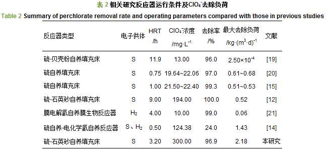 結果表明, R1、R2、R3對高濃度ClO4-耐受性良好, 當ClO4-低于250 mg ·L-1時均能完全去除; 當濃度提升至300 mg ·L-1及以上時, 反應器對ClO4-去除效果出現惡化, 此時生物膜的傳質速率影響了ClO4-的去除效果;當HRT≤2.4 h時, 隨著HRT的減小, 上升流速增加, 減少了ClO4-進入生物膜的時間并限制了硫的溶解, 導致ClO4-去除率不斷下降.整個過程中R1反應器去除率最高, R2、R3依次減小, 主要由于R1硫含量最高, 可提供電子供體最多.本實驗與相關研究的運行條件和ClO4-去除負荷的對比如表 2所示.在保證ClO4-去除率高于95%的情況下, R1反應器在第Ⅶ階段, 達到最大去除負荷為2.18 kg ·(m3 ·d)-1, 高于其他研究.