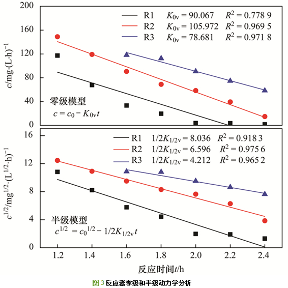 在實際應用中, 污染物去除的動力學研究是一個關鍵因素, 有相關研究利用零級和半級動力學模型對硫自養填充床去除NO3-和ClO4-進行研究.零級動力學模型和半級動力學模型的公式如下: