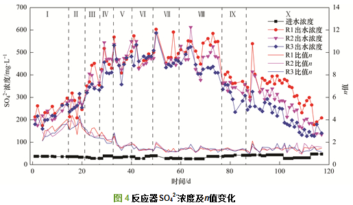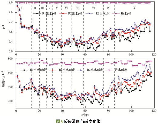 在Ⅰ階段, R1、R2、R3出水pH比較接近, 之后的Ⅱ~Ⅹ階段中, R1的pH和堿度最低, R2次之, R3最高.表明當ClO4-去除率基本相同時(進水ClO4-濃度 < 300 mg ·L-1時), R1的硫歧化反應最強, R3最弱; 當ClO4-去除率不一致時, R1、R2、R3去除ClO4-所產生的H+濃度不同, 導致出水pH和堿度出現差異.