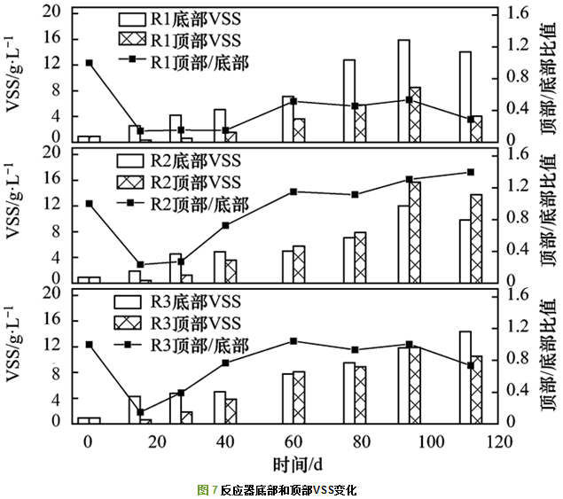 對R1、R2、R3頂部和底部VSS的比值對比發現, 隨著進水ClO4-濃度的提升, 比值不斷增大. R2、R3的頂部VSS增長比較快, 比值在60 d后穩定在1左右, 而R1頂部VSS一直較少, R2、R3的掛膜效果優于R1.這是由于R2、R3反應器硫顆粒比例較少, 在底部只能去除部分ClO4-, ClO4-在整個反應器中均勻去除, 使得生物膜均勻生長.由此表明, R2、R3對硫顆粒的利用率較高.