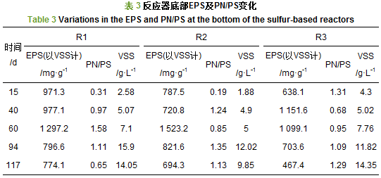 戚韓英等發現EPS可以增強細胞間架橋作用, 利于細胞聚集、成膜, 其在生物膜形成過程起作用的主要組分為多糖、蛋白.由表 3可知, R1、R2的EPS含量在60 d之前處于增長狀態; 而R3在第40~60 d出現小幅度下降, 但也處于較高狀態.與此相關, 反應器VSS在60 d之前增長速度較快.有研究表明較短的HRT不利于EPS的形成, 在本研究中反應器在第Ⅹ階段, R1、R2、R3所分泌的EPS隨著HRT的減小出現不同程度的下降.