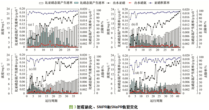氨氮去除率、亞硝酸鹽氮積累率、硝酸鹽氮積累率、比氨氮氧化速率(SAOR)、比亞硝酸鹽氮產生速率(SNiPR)和比硝酸鹽氮產生速率(SNaPR)的計算參考孫洪偉等的公式進行.