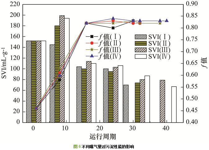 污泥活性和沉降性能的好壞影響著短程硝化的恢復及穩定性, 其中污泥容積指數(SVI)和f值(MLVSS/MLSS)是影響反應穩定運行的重要參數.反應過程中控制MLSS為2 000~3 000 mg ·L-1, 曝氣量為120 L ·h-1時, SVI一直呈現下降的趨勢, 而其他3種曝氣量下均先增加后逐漸減少, 運行周期結束時, SVI值均穩定在60~80 mL ·g-1(圖 6), 污泥具有良好的沉降性能. f值均呈現先增加后逐漸趨于穩定的趨勢, 16周期之間基本都呈現線性增長的趨勢, 最后穩定在0.82~0.83(圖 6).張為堂等通過二次啟動發現, 反應器內污泥的SVI值逐漸降低, 試驗末SVI值均穩定在82 mL ·g-1左右, 具有了非常好的沉降性能, 與本研究結果一致.本研究結果表明, 不同曝氣量下都能夠實現污泥的活性恢復, 污泥都具有較高的活性和良好的沉降性能.