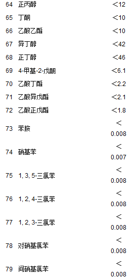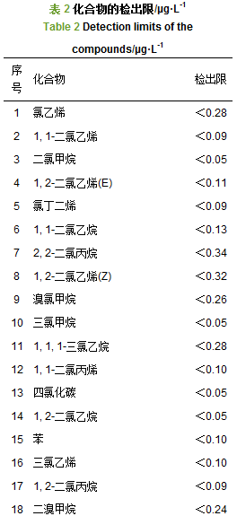 吹掃捕集/氣相色譜-質譜法檢測73種VOCs, 分別是1~72號化合物.該方法前處理為:將裝滿水樣的40 mL樣品瓶放入多功能液/固自動吹掃捕集儀(TEKMAR ATOMX)的自動進樣器中等待自動進樣.儀器測試條件為:①氣相色譜儀(7890A):色譜柱:DB-624 60 m×0.32 mm×1.80 μm; 柱流速:氦氣1.5 mL·min-1, 恒定; 進樣口:溫度200℃, 分流進樣, 分流比5 :1;柱室:程序升溫, 起始溫度40℃, 保持1 min; 升溫速率6℃·min-1, 升溫至80℃, 保持1 min; 升溫速率10℃·min-1, 升溫至140℃, 保持1 min; 升溫速率20℃·min-1, 升溫至200℃, 保持10 min; 質譜檢測. ②質譜儀(5975C):MS Source(離子源):230℃, MS Quad(四極桿):150℃, Thermal Aux(氣質接口):250℃, Solvent Delay(溶劑延遲):1 min, Scanning Mass Range(質量掃描范圍):29.0~350.0 u.. ③吹掃捕集儀測定條件:吹掃-捕集溫度:20℃, 吹掃時間:11 min, 解吸溫度:250℃, 解吸時間:2 min; 捕集管烘烤溫度:280℃, 烘烤時間:5 min. 表 2可知方法檢出限范圍為0.05~95 μg·L-1, 其中酯類、醛類、酮類、醇類檢出限范圍為1.6~95 μg·L-1, 要明顯高于其他化合物的檢出限(0.05~0.49 μg·L-1).通過做樣品平行樣、方法空白以及加標回收進行質量保證與質量控制; 73種VOCs平行樣相對偏差1.1%~14.5%, 方法空白無被測項目檢出, 加標平均回收率為73.8%~132%.