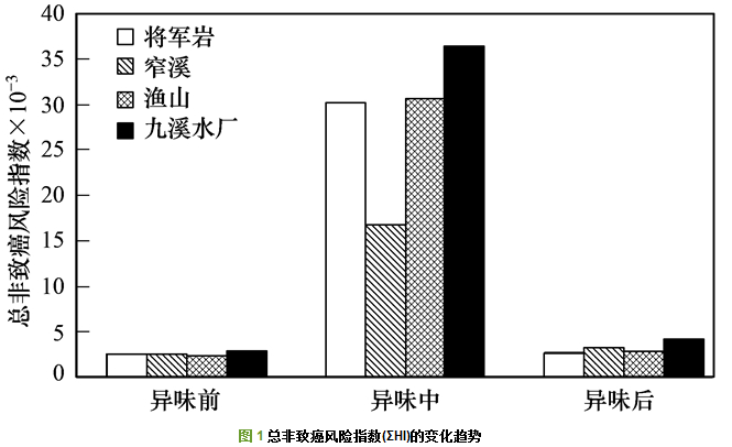 根據美國EPA的相關定義, 對于非致癌風險, 當風險指數超過1時, 認為會對人體健康產生危害.由圖 1可以看出, 4個斷面水樣中VOCs和SVOCs總非致癌風險指數ΣHI范圍大致為2.4×10-3~3.6×10-2, 遠遠小于1, 屬于社會人群可接受區間, 說明這些污染物不會對人體產生明顯的非致癌健康危害.從時間范圍來看, 異味事件發生期間, ΣHI范圍為1.7×10-2~3.6×10-2, 顯著高于發生前3個月或后3個月, 高出幅度大致為4~12倍, 風險大幅放大.從空間分布來看, 異味事件發生期間, 各監測斷面水體ΣHI最大值為3.6×10-2, 為下游的九溪水廠監測斷面, 最低為中游的窄溪監測斷面, 風險指數僅為1.6×10-2, 從中游到下游ΣHI增加了1.2倍, 表明錢塘江杭州段中下游水體ΣHI總體成富集趨勢.