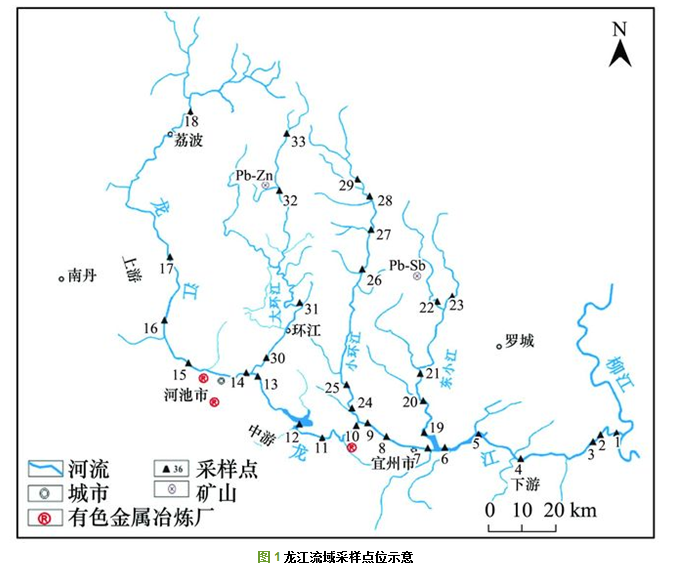 廣西龍江是珠江上游的重要支流, 其干流有84%河段流經(jīng)被譽(yù)為“有色金屬之鄉(xiāng)”的河池市境內(nèi).龍江是河池市和柳州市重要的居民飲用和農(nóng)業(yè)灌溉水源地, 其水體水質(zhì)好壞將直接影響到流域內(nèi)數(shù)百萬(wàn)居民飲水安全.近年來(lái), 流域內(nèi)快速增長(zhǎng)的有色金屬開(kāi)采與冶煉等工業(yè)活動(dòng)已對(duì)龍江水環(huán)境造成了嚴(yán)重的重金屬污染問(wèn)題.尤其是2012年1月龍江河發(fā)生突發(fā)性Cd污染事件, 約21 t的Cd被排放到龍江河中, 對(duì)流域水體水質(zhì)安全構(gòu)成了極大的威脅.