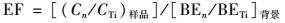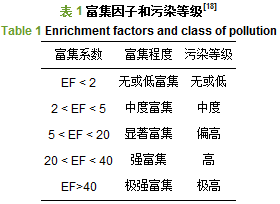 富集系數(shù)(EF)被廣泛運(yùn)用于評(píng)價(jià)沉積物或土壤中重金屬的污染程度的研究.一般用于重金屬標(biāo)準(zhǔn)化的元素有:Al、Fe、Mn、Sc、Ti和Zr等.本文選取Ti作為標(biāo)準(zhǔn)化元素, 因?yàn)門(mén)i屬于惰性元素, 在次生環(huán)境中通常不活躍.富集系數(shù)的計(jì)算公式如下: