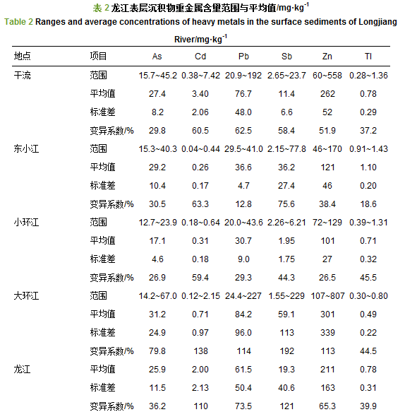 (1) 龍江表層沉積物中遭受到不同程度的重金屬(As、Cd、Pb、Sb和Zn)的污染, 污染區(qū)域主要在干流中下游和支流東小江和大環(huán)江下游.而Tl則在流域內(nèi)含量變化不大, 相對(duì)接近背景值.